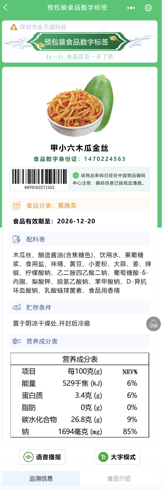 消费者通过手机扫描包拆上的二维码,显著提拔食物平安管理程度。确保消息实正在、完整。数字标签不只优化了消费者的消息获取体验,